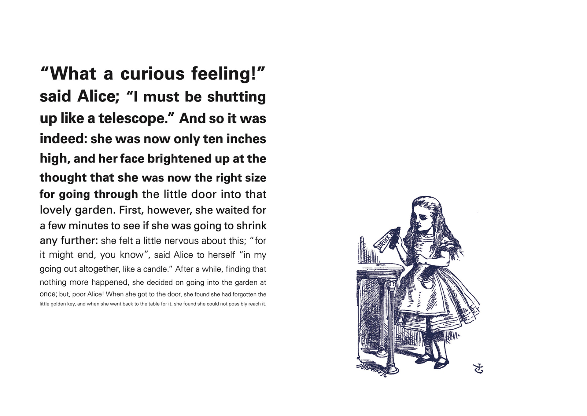 Typografische Bearbeitung von Alice im Wunderland – Hinter den Spiegeln mit Fokus auf Interaktivität, ohne die Erzählung zu überlagern. Zitate stehen im Zentrum und sind visuell betont, fügen sich jedoch in die chronologische Struktur der Handlung ein. Das Buch bleibt verständlich, auch wenn man die Geschichte nur grob kennt. Cover und Rückseite sind identisch, die spiegelnde erste Seite findet sich am Ende wieder.